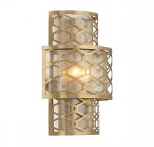 The Mannheim 2-light sconce is certain to draw attention in any space with its beautifully intricate latticework design, textured mica shade that creates an inviting glow and the Warm Brass finish. It is 16" in height, 11.88" in width and extends 6" from the wall. Uses two candelabra size bulbs of up to 60 watts per bulb. Bulbs not included.