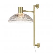 A modern take on the classic torchiere, the bright Satin Brass frames support thick textured glass cauldrons illuminated with dedicated LED modules. The 2-Light pendant and swing arm pin-up sconce feature rotatable shades directing the light either upward