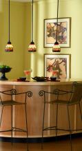 The earthy style of the West End Collection is a great way to bring the drama of Tiffany art glass into a more rustic or contemporary room setting. The hand cut iridescent art glass is arranged in a soft geometric pattern and features the rich color pal